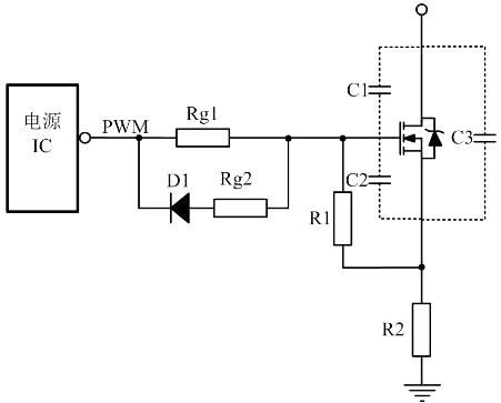 關(guān)斷瞬間驅(qū)動電路能提供一個盡可能低阻抗的通路供MOSFET柵源極間電容電壓快速泄放,保證開關(guān)管能快速關(guān)斷。為使柵源極間電容電壓的快速泄放,常在驅(qū)動電阻上并聯(lián)一個電阻和一個二極管。